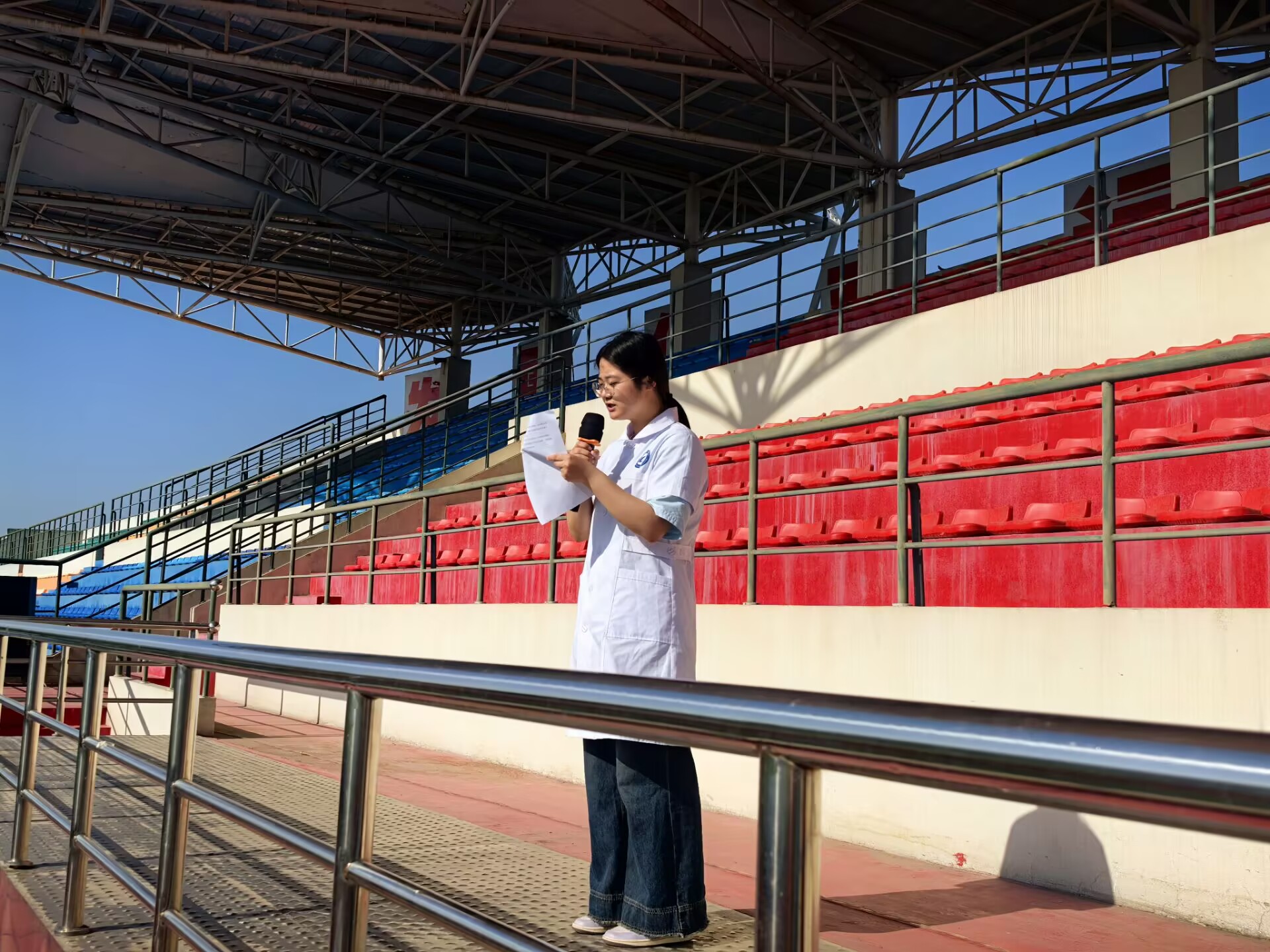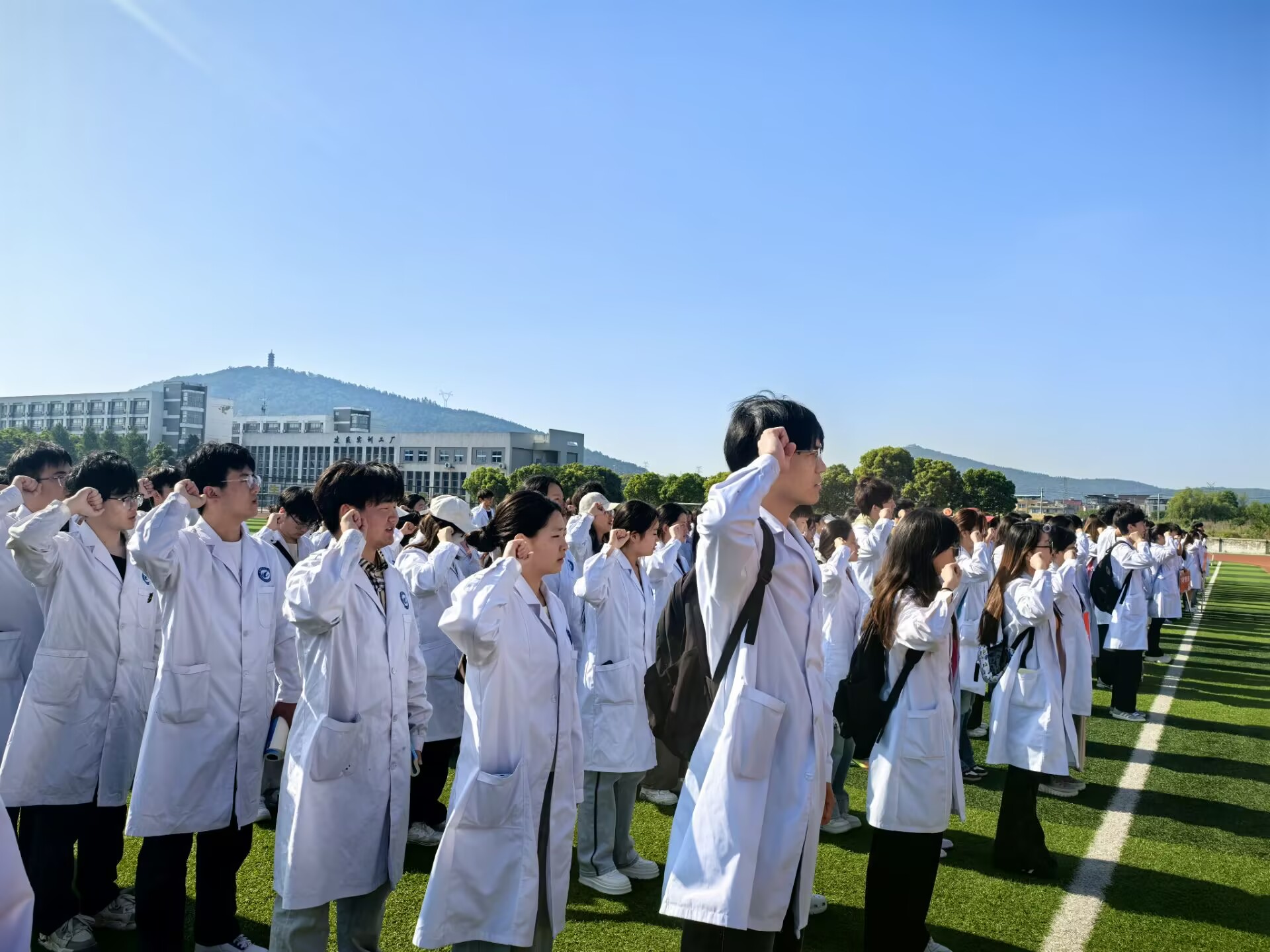 随后,24医检2班的孙冰洋同学带领全体同学庄严宣读“医学生誓言”。“健康所系,性命相托……”铿锵有力的誓言回荡在运动场上空,彰显了医学生们立志献身医学事业、守护人民健康的坚定信念。