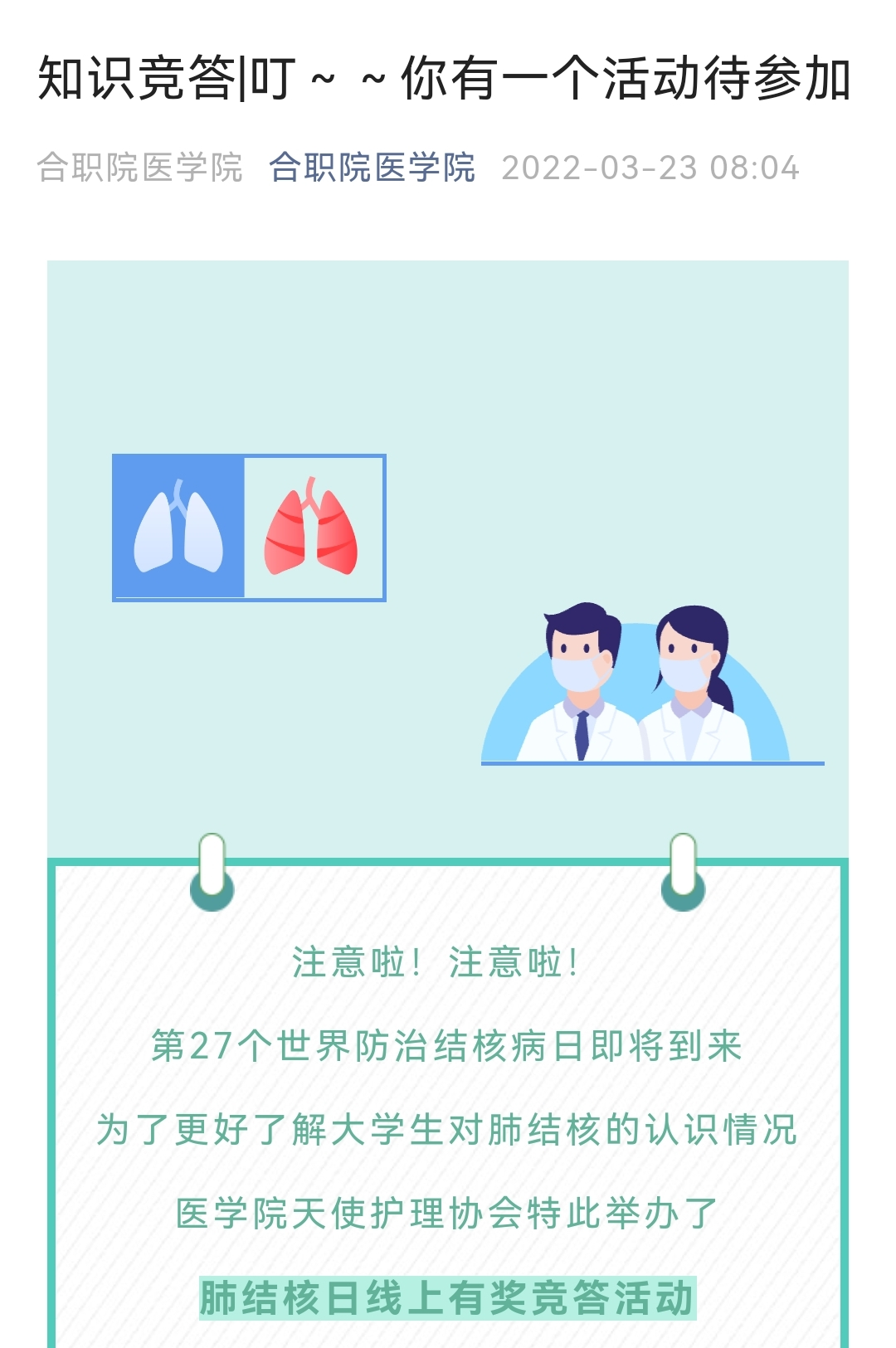 为宣传结核病有关知识,加深大学生对肺结核的了解,提高大学生面对结核病的自我防护意识,在第27个“世界防治结核病日”来临之际,澳门十大信誉好的网站天使护理协会开展了以“携手抗疫防痨 守护健康呼吸”为主题的线上知识竞答活动,以此加强对防治结核病的宣传,呼吁大家积极与结核病危机作斗争。