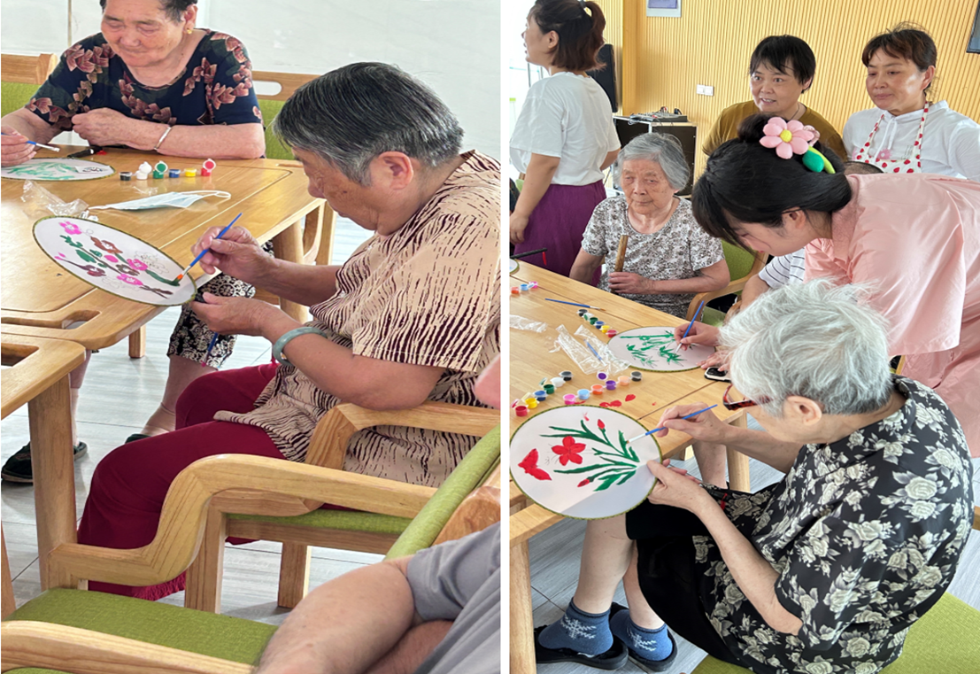接下来几天里,各项服务活动有条不紊地展开。志愿者们拿起清洁工具,将养老院各个角落清理得干干净净。在为老人们收拾房间的同时,同学们还不忘与老人们热情聊天。看着同学们风风火火的身影,爷爷奶奶的情绪也被感染,几天的志愿服务时间里,老人们脸上始终洋溢着灿烂的笑容。为了给养老院里爷爷奶奶们单调的生活增添乐趣,天使护理协会的同学们充分发挥才艺技能,在老师和院方的指导下,组织了一场团扇绘画活动。在志愿者们的陪伴和帮助下,老人们兴奋地拿起画笔,相互比拼着制作“最美团扇”,欢声笑语充满了整个养老院。