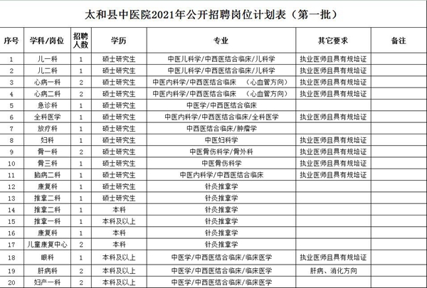 招聘人数及岗位需求详见《太和县中医院2021年公开招聘岗位计划表》(附件)。