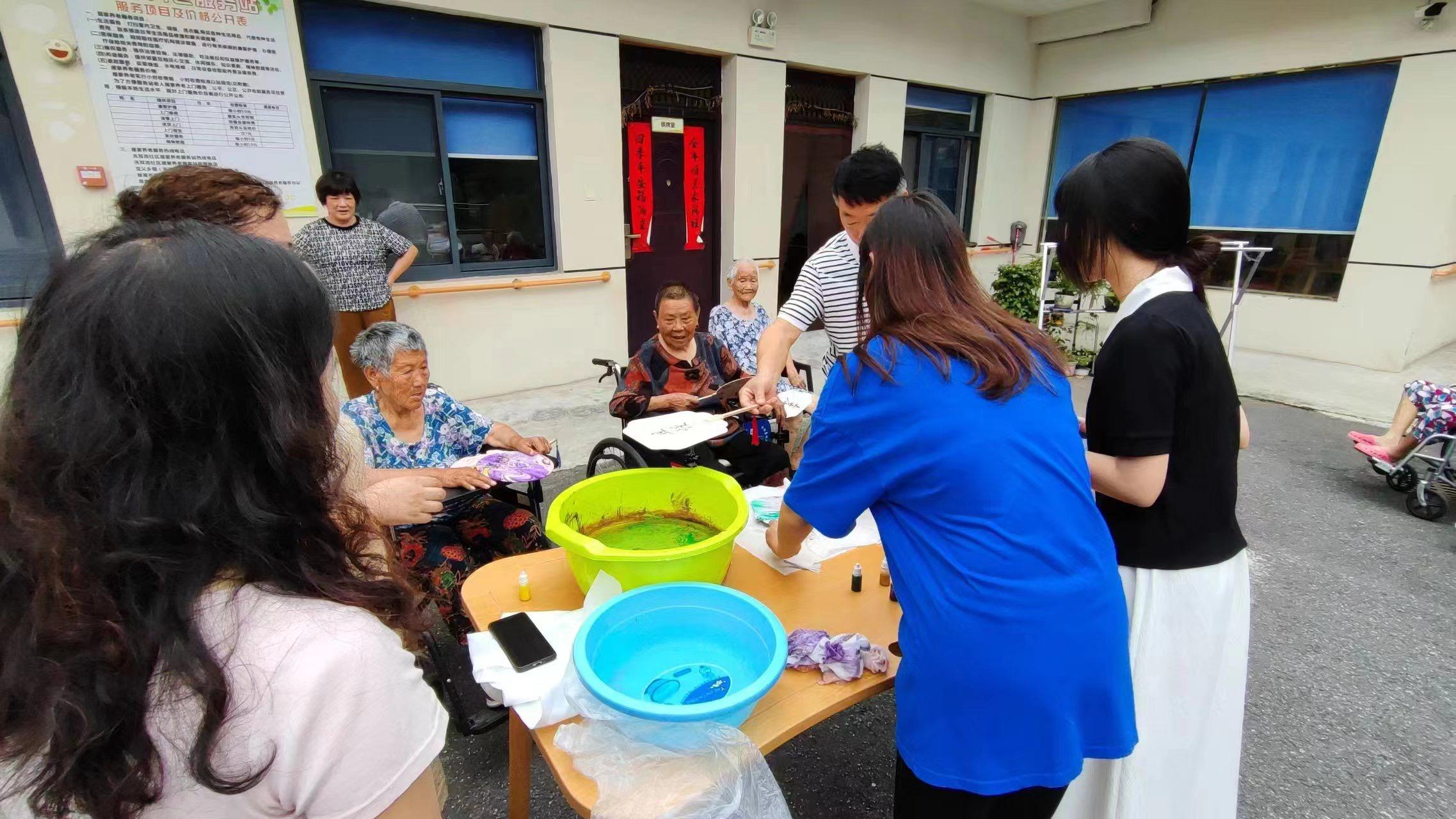 为了增添老人们的生活乐趣,丰富他们的文化娱乐活动,志愿服务期间,同学们在老师和工作人员的指导下,组织了一场漆扇制作活动。老人们踊跃参加,认真听志愿者们介绍操作方法,分配到制作工具之后就迫不及待地准备大显身手。尽管最后做出来的漆扇并不是每一个都很完美,但爷爷奶奶们看着自己的创作成果都喜笑颜开,养老院充满了欢声笑语。