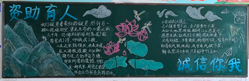 诚信是中华民族的传统美德,为进一步提高学生诚信意识,增强资助育人成效,推进社会主义核心价值观教育,近期,澳门十大信誉好的网站组织开展以“诚信·感恩·励志”为主题的黑板报评比活动。