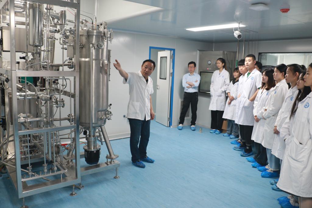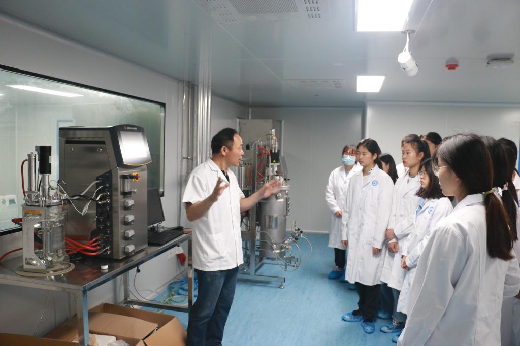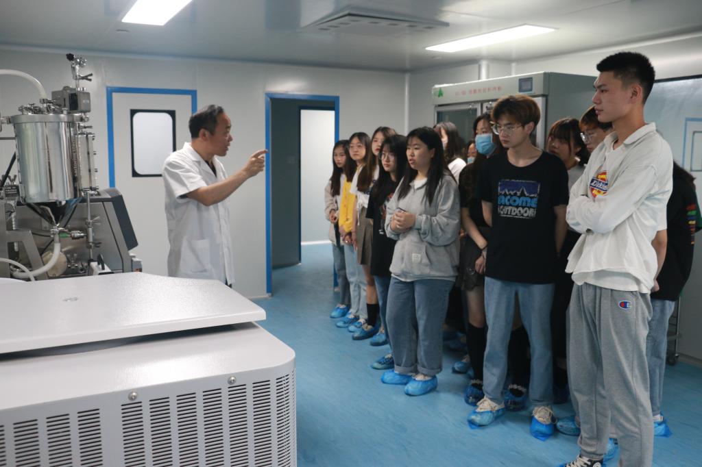 活动负责人详细介绍了平台布局,引导学生参观了原核表达实验室、真核表达实验、冷冻干燥等主要洁净实验室,讲解了实验室是做什么的,如何完成生物蛋白的生产流程及重要仪器设备的作用。