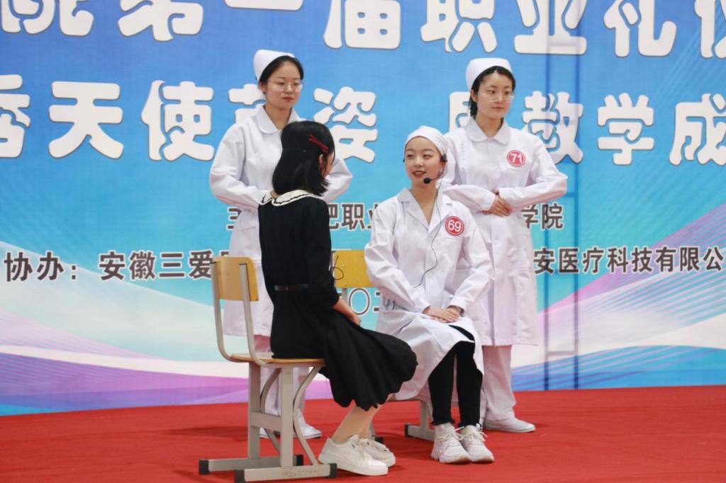 落落大方展风采。本次比赛根据专业情况设置情景,大赛覆盖面广、组织有序,学生参与度高,参赛选手准备充分,赛出水平、赛出风格。选手们通过站姿、走姿、坐姿、蹲姿(拾物)、持病历夹、端盘姿态、交流沟通等自由组合成案例场景进行职业礼仪风采展示。选手们充分展示了日常工作中规范优美的礼仪举止,赢得了在场观众的好评。