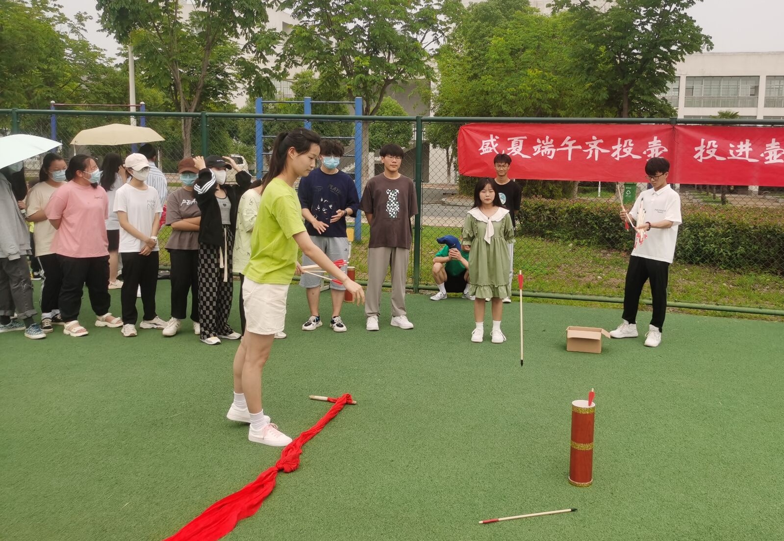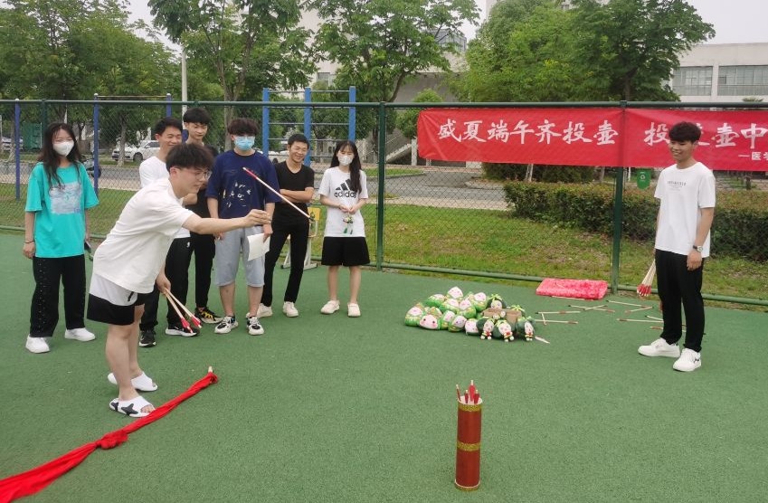 粽叶飘香迎端午,投中壶中相思情,“趣味投壶”活动在田径运动场吸引大量学生的热情参与和围观。同学们踊跃参加,积极尝试,现场气氛热烈。男女生参赛队员各显身手,操场上不断传来大家的欢笑声,接连不断的叫好声、欢笑声回荡在整个场地,随着同学们的精彩表现,活动现场的气氛出现一个又一个的高潮。